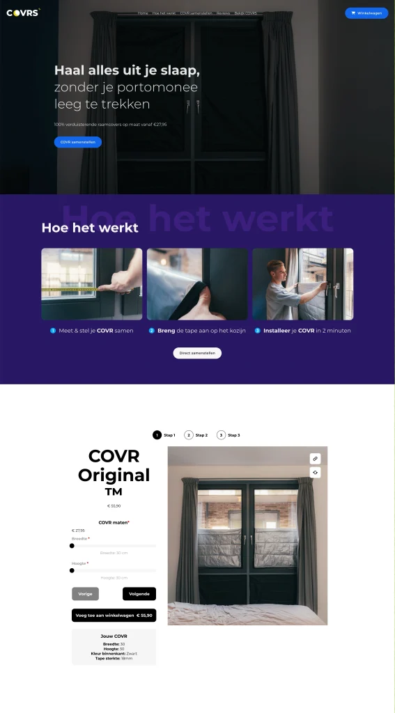 I designed and built COVRS.nl, a conversion-focused product site for custom 100% blackout window covers. The site features a guided “how it works” flow, a lightweight configurator to select exact sizes and options, clear value props (donkergarantie, 24u verzending), and prominent CTAs to assemble and order. I focused on persuasive copy hierarchy, fast performance, and a frictionless checkout to turn sleep problems into quick, on‑site purchases.